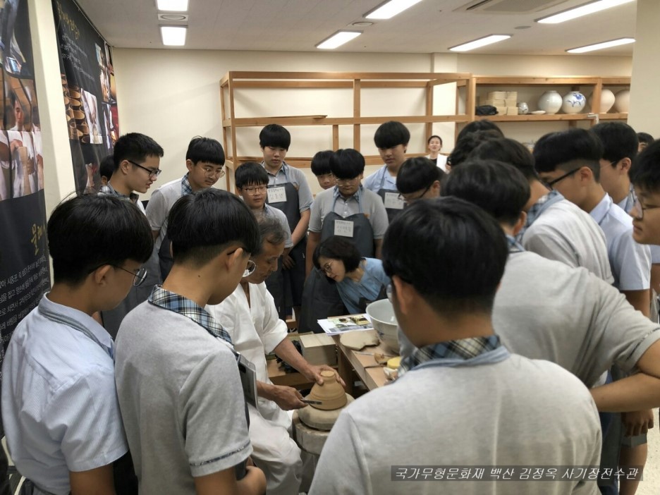 - 2018년 문화재청 전수교육관 활성화 사업 [전수관 자유학기제 3차 수업] "국가무형문화재 백산 김정옥 사기장과 함께하는 미래의 사기장인을 꿈꾸다!" 문경중학교 2학년 3반⊙ 날짜: 2018년 7월 12일(목) ⊙ 시간: 오전 9시-12시(3시간)⊙ 참석자 수: 29명 (학생: 27명 인솔교사:2명)