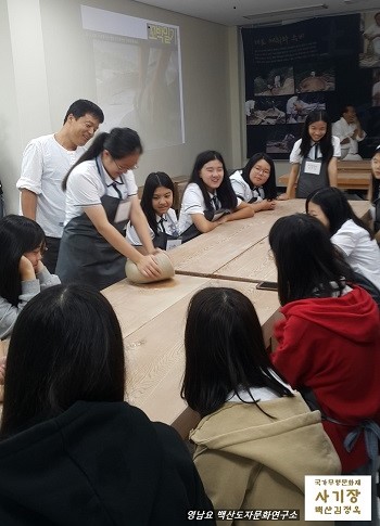 - 2018년 문화재청 전수교육관 활성화 사업 [사기장전수관 자유학기제 8차 수업] "국가무형문화재 백산 김정옥 사기장(영남요)과 함께하는 미래의 사기장인을 꿈꾸다!" 문경여중학교 1학년 3반 ⊙ 날짜: 2018년 8월 30일(목) ⊙ 시간: 오전 9시-12시(3시간)⊙ 참석자 수: 29명 (학생: 28명 인솔교사:1명)