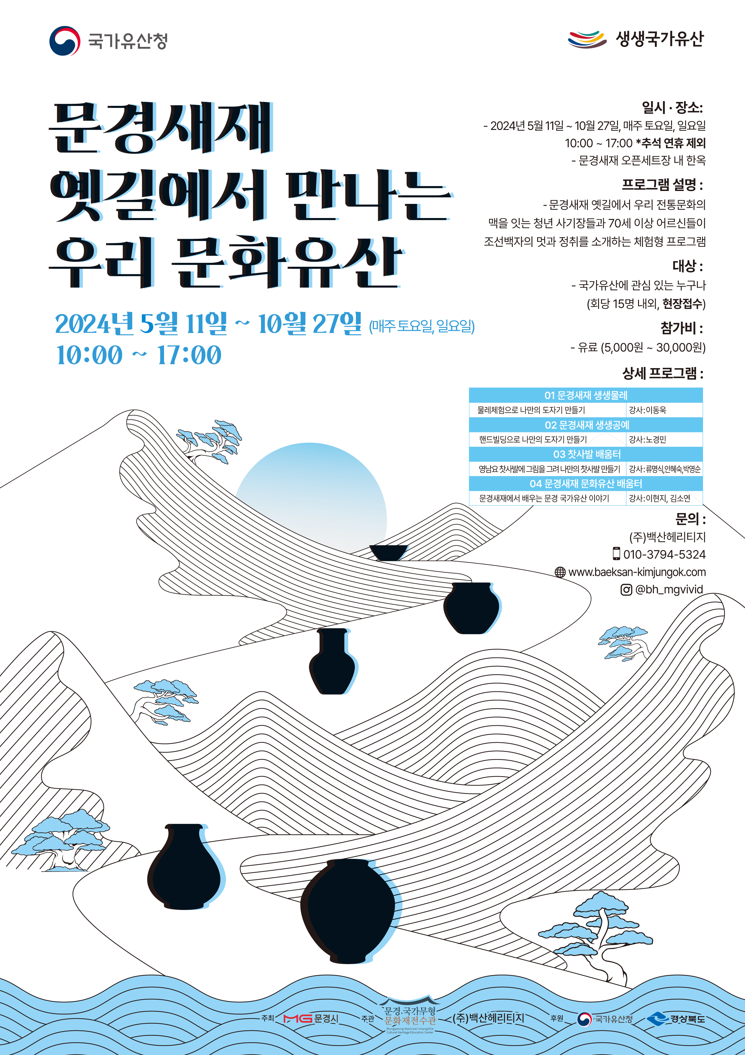 생생문화재사업 : 문경새재 사기장 힐링문화캠프, 조선왕실 사기장의 24시 생생체험, 우리들의 아주 특별한 생생물레, 문경새재 인문학 아카데미, 문경의 도자기 생태환경 탐구하기,