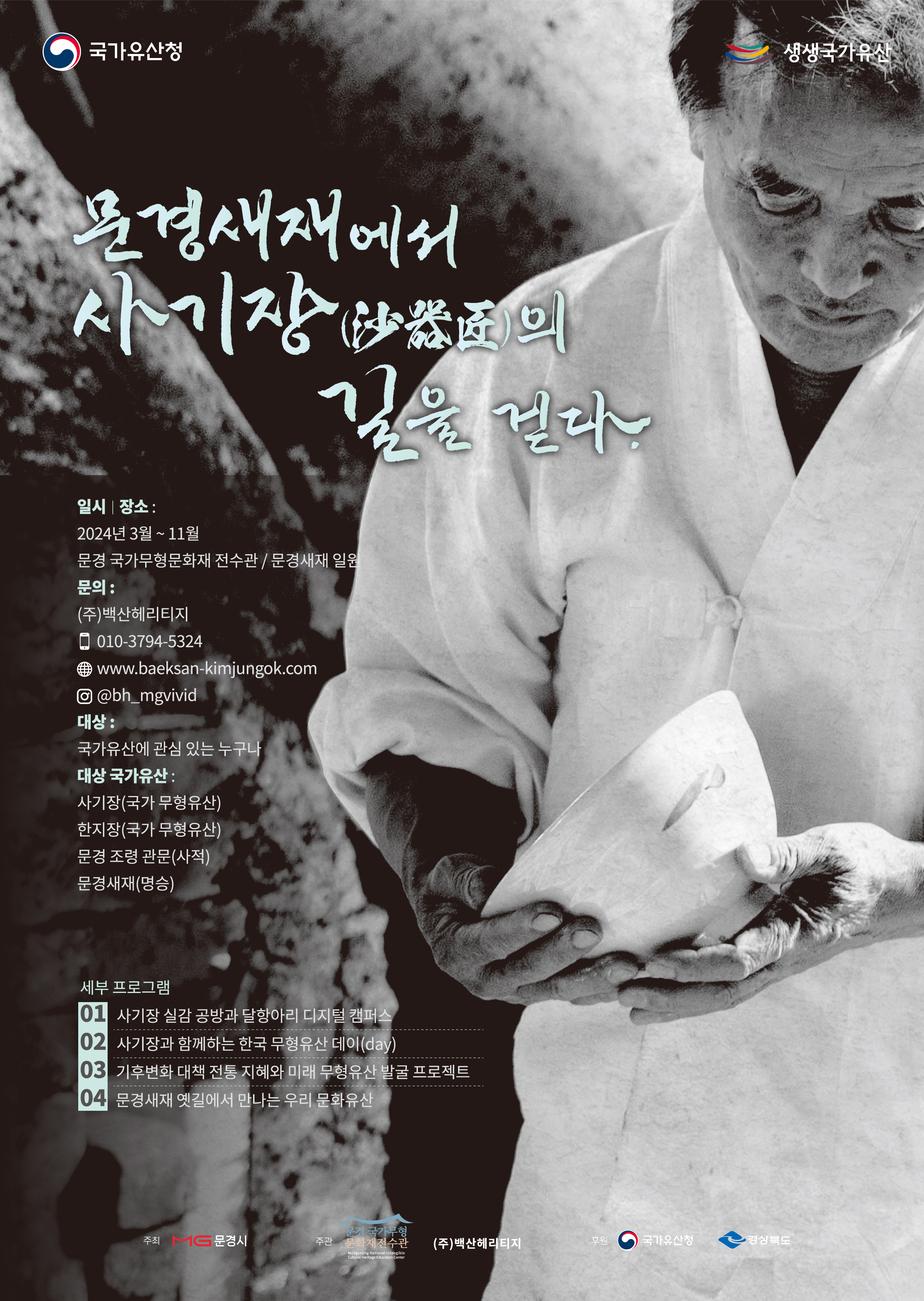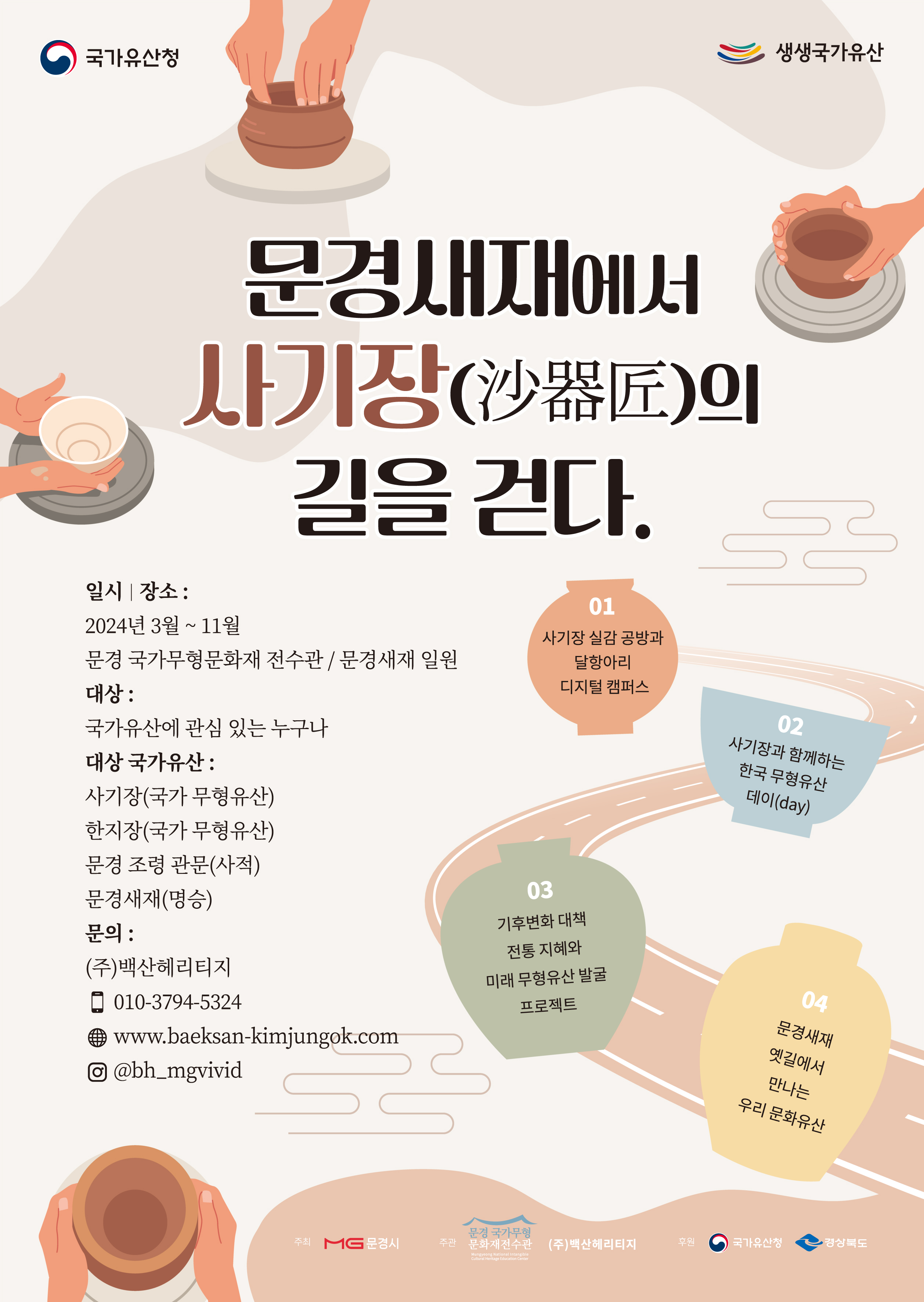 경상북도 문경시 (주)백산헤리티지는 2024년 문화재청 생생국가유산 사업인‘문경새재에서 사기장(沙器匠)의 길을 걷다’프로그램을 본격 시작했다.