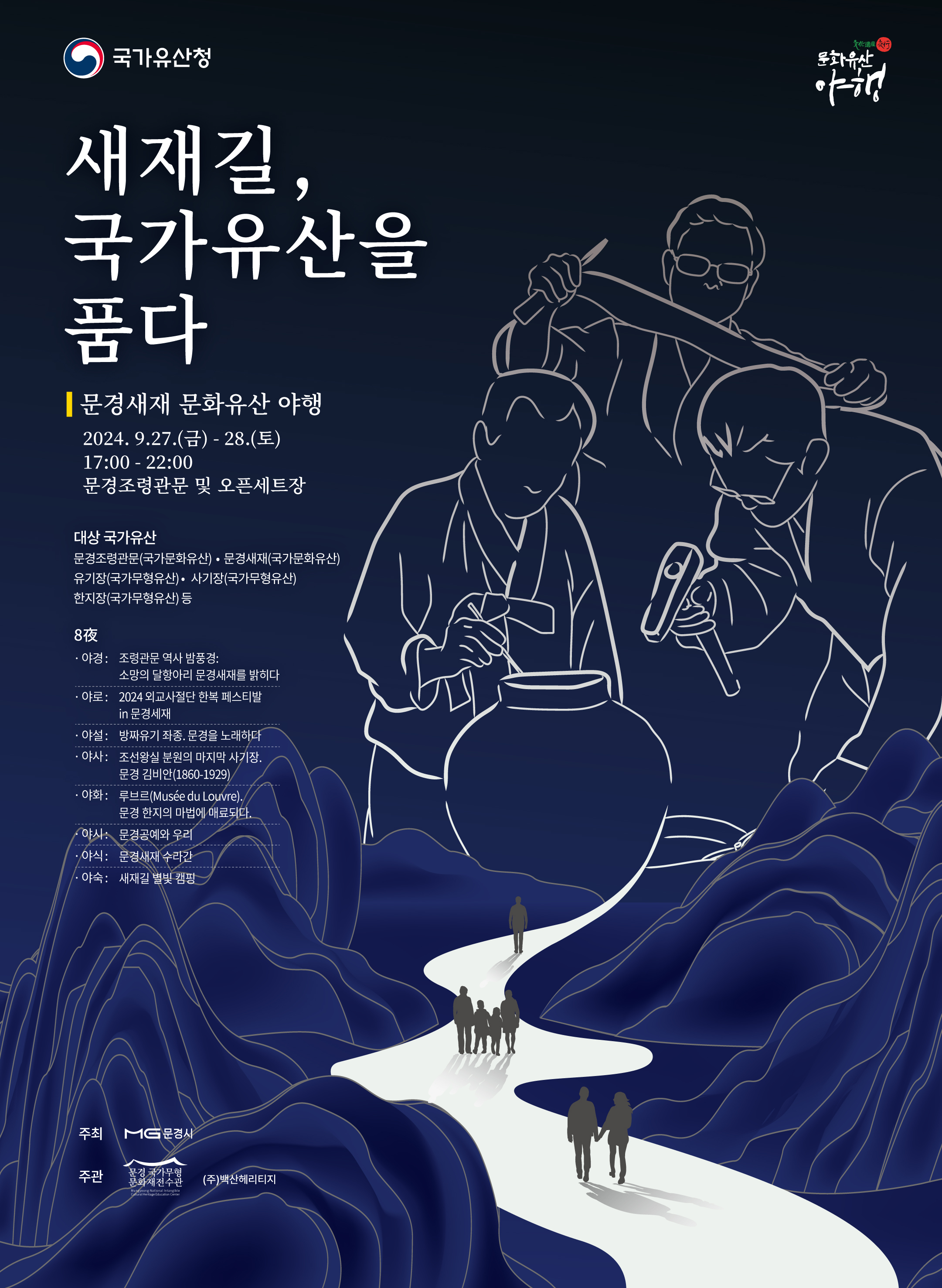 “새재길. 국가유산을 품다”를 주제로 한 문경시 문화유산 야행은 다양한 분야의 무형유산을 하나의 전시, 체험 및 공연 행사로 결합하는 무형유산 통합행사로, 전통 공예 장인과 문인들의 무형유산을 야간 감성여행, 자각여행 문화콘텐츠로 운영하여 문경의 문화유산 관광사업의 영역을 확장하고자 마련된 국가유산 야간행사로 개최될 예정이다.