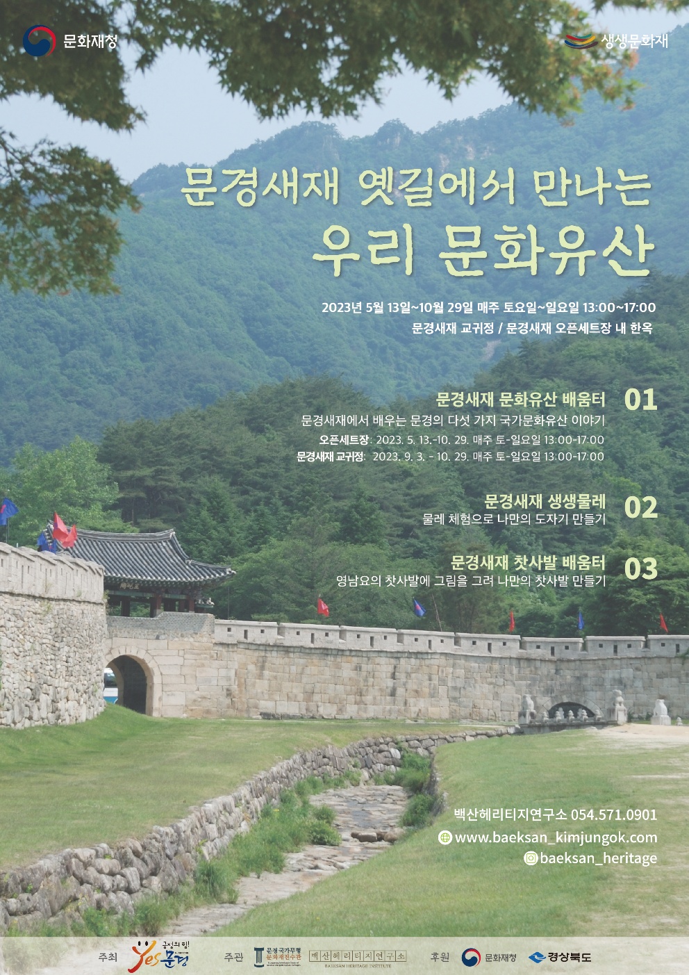 생생문화재사업 : 문경새재 사기장 힐링문화캠프, 조선왕실 사기장의 24시 생생체험, 우리들의 아주 특별한 생생물레, 문경새재 인문학 아카데미, 문경의 도자기 생태환경 탐구하기,